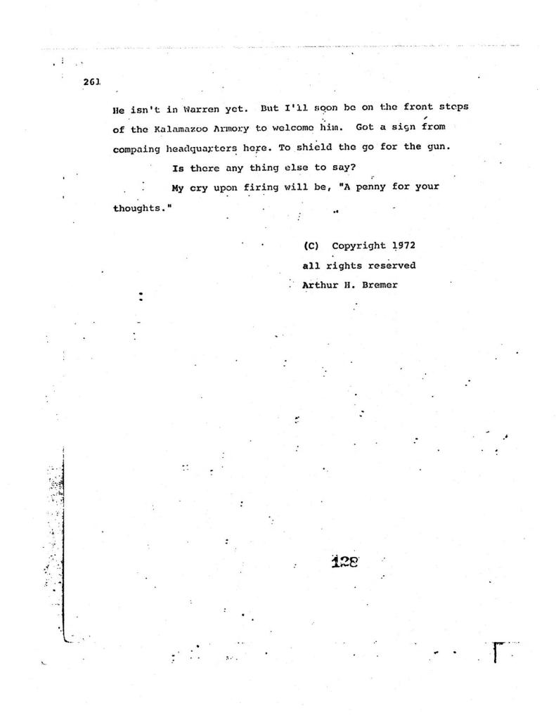 À, nhờ anh Bê cho biết thì tui mới biết được phim cũng dựa trên việc có thiệt. Phần nào thì Paul Schrader cũng dựa trên người thật là Arthur Bremer, tính ám sát Nixon hoặc là George Wallace, cũng cạo đầu và viết nhật ký vạch ra kế hoạch ám sát. Đọc trang nhật ký của Bremer, phần nào tui cũng giải phóng được đầu óc hẹp hòi của mình về việc phim ảnh chắc cũng k quá phóng đại đầu óc của những người như Bremer, nhưng mà tui biết chắc rằng Bremer rất tức vì quên la lên “A penny for your thoughts” khi bắn vào đầu Wallace. Nếu tui làm đạo diễn, tui sẽ cho nhân vật dằn vặt dữ lắm.